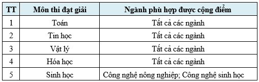 Cộng 1.5 điểm: Giải khuyến khích HSG quốc gia; thí sinh đạt giải tư cuộc thi khoa học, kỹ thuật cấp quốc gia do Bộ Giáo dục và Đào tạo tổ chức, cử tham gia dự tuyển vào ngành phù hợp với môn thi, hoặc nội dung đề tài dự thi đã đoạt giải, thời gian đoạt giải không quá 3 năm tính tới thời điểm xét.