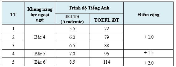 Thí sinh xét tuyển theo kết quả thi tốt nghiệp trung học phổ thông năm 2025 bằng tổ hợp không có môn tiếng Anh hoặc xét tuyển theo kết quả thi HSA không có phần tiếng Anh và đồng thời có chứng chỉ tiếng Anh quốc tế còn thời hạn (IELTS Academic đạt từ 5.5 trở lên, TOEFL iBT đạt từ 72 điểm trở lên), đạt trình độ từ bậc 4 trở lên theo Khung năng lực ngoại ngữ 6 bậc dùng cho Việt Nam sẽ được cộng điểm thưởng vào tổng điểm xét tuyển.