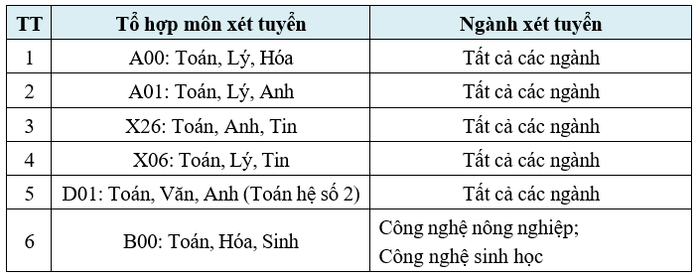 A00 (Toán, Lý, Hóa); A01 (Toán, Anh, Lý); B00 (Toán, Hóa, Sinh); X26 (Toán, Anh, Tin); X06 (Toán, Lý, Tin); D01: Toán, Văn, Anh (Toán hệ số 2).