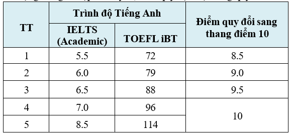 Thí sinh có chứng chỉ tiếng Anh quốc tế (IELTS Academic hoặc TOEFL iBT) còn thời hạn sử dụng 2 năm kể từ ngày thi, sẽ được quy đổi thành điểm môn tiếng Anh để sử dụng trong tổ hợp xét tuyển.