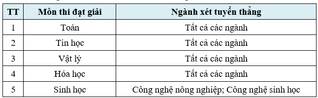 Thí sinh đoạt giải nhất, nhì, ba trong kỳ thi chọn học sinh giỏi quốc gia, quốc tế hoặc thi khoa học, kỹ thuật cấp quốc gia, quốc tế do Bộ Giáo dục và Đào tạo tổ chức, cử tham gia; thời gian đoạt giải không quá 3 năm tính tới thời điểm xét tuyển thẳng và tốt nghiệp trung học phổ thông năm 2025 được xét tuyển thẳng vào bậc đại học theo ngành phù hợp với môn thi hoặc lĩnh vực, nội dung đề tài dự thi mà thí sinh đã đoạt giải. Cụ thể như sau: