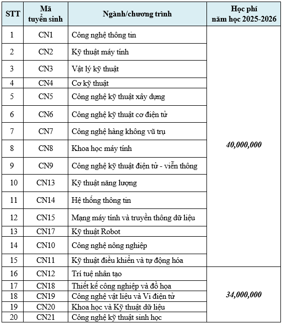 Năm học 2025-2026, mức học phí của Trường Đại học Công nghệ dao động từ 34-40 triệu đồng/năm học. Mức học phí có thể được điều chỉnh cho các năm học sau, nhưng không tăng quá 15% mỗi năm. Cụ thể như sau: