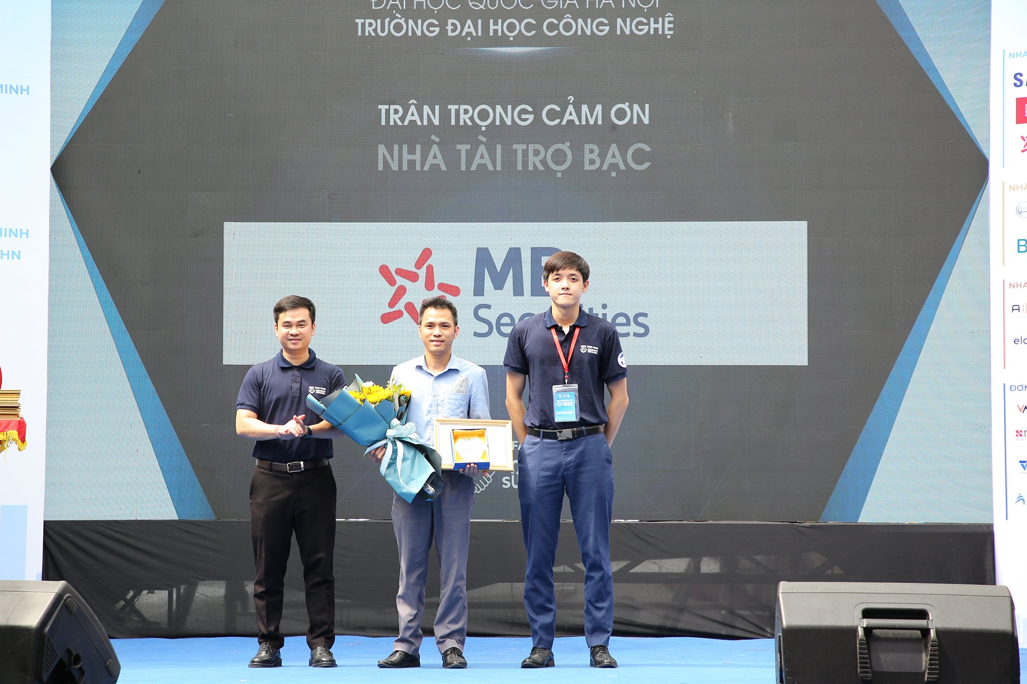 TS. Trần Cường Hưng – Bí thư Đoàn thanh niên (bên trái) và ThS. Phan Hoàng Anh – Chủ tịch Hội sinh viên (bên phải) tặng hoa cảm ơn nhà tài trợ Bạc và Đồng