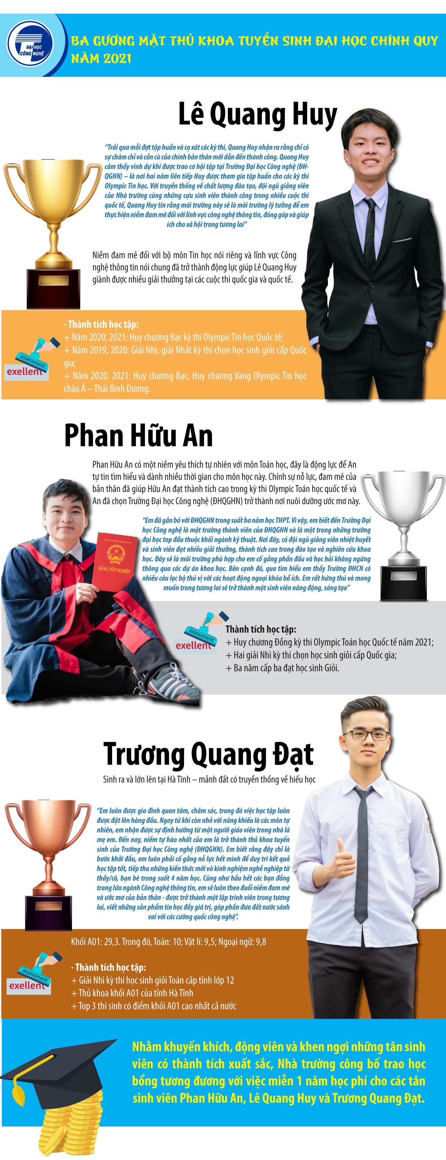 Vượt qua nhiều thí sinh trong kỳ thi tuyển sinh đại học chính quy năm 2021, các tân sinh viên Phan Hữu An, Lê Quang Huy và Trương Quang Đạt với thành tích xuất sắc đã nhập học thành công vào Trường Đại học Công nghệ, ĐHQGHN. Trong đó, Trương Quang Đạt với 29,3 điểm trở thành thủ khoa tuyển sinh đại học chính quy năm 2021; Lê Quang Huy, Phan Hữu An là những tân sinh viên đạt nhiều thành tích cao tại các cuộc thi Olympic quốc tế và được tuyển thẳng vào Trường.