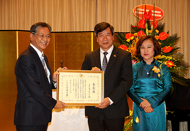 Đại sứ đặc mệnh toàn quyền Nhật Bản tại Việt Nam Hiroshi Fukada trao Bằng khen của Bộ Ngoại giao Nhật Bản cho PGS.TS Nguyễn Ngọc Bình (thứ hai, bên phải ảnh) năm 2014