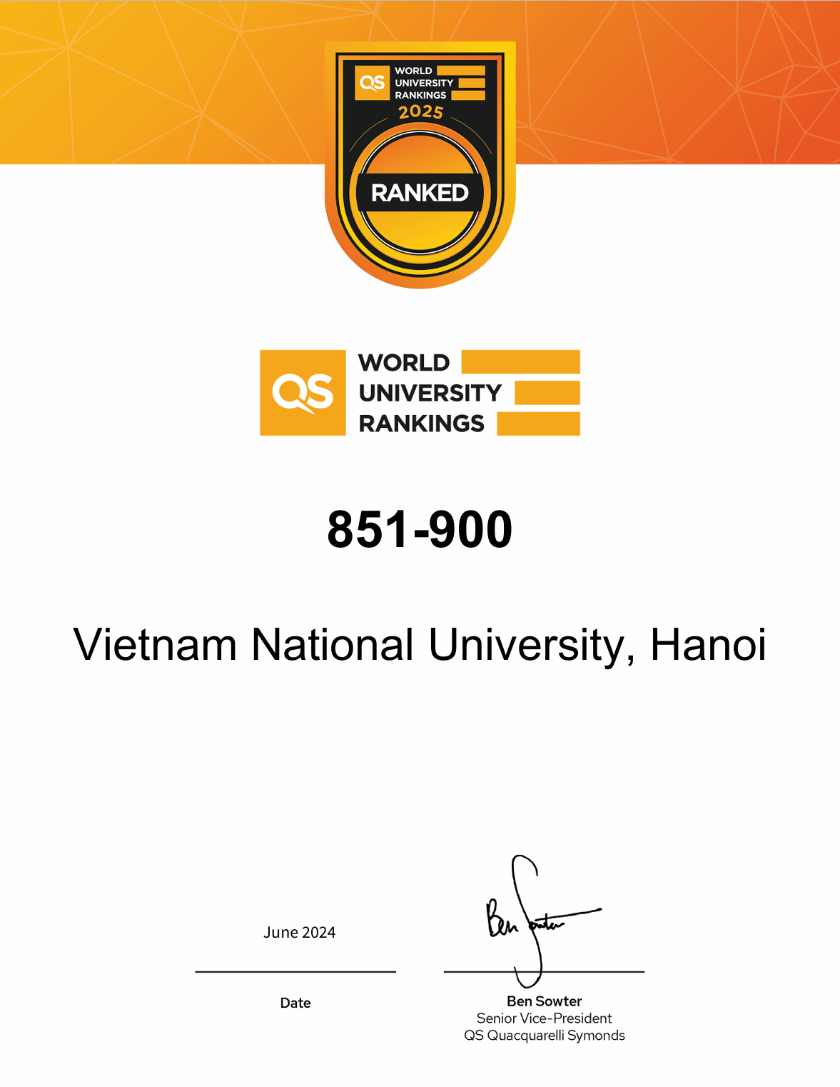 Ngày 5/6/2024, Tổ chức Quacquarelli Symonds (QS) đã công kết quả Bảng xếp hạng đại học thế giới QS World University Rankings 2025 (QS WUR 2025). Trong đó, Đại học Quốc gia Hà Nội (ĐHQGHN) đã có sự gia tăng mạnh mẽ lên vị trí trong nhóm 851-900 các cơ sở giáo dục đại học tốt nhất thế giới theo tiêu chí xếp hạng của QS WUR (so với lần xếp hạng trước là nhóm 951-1000).