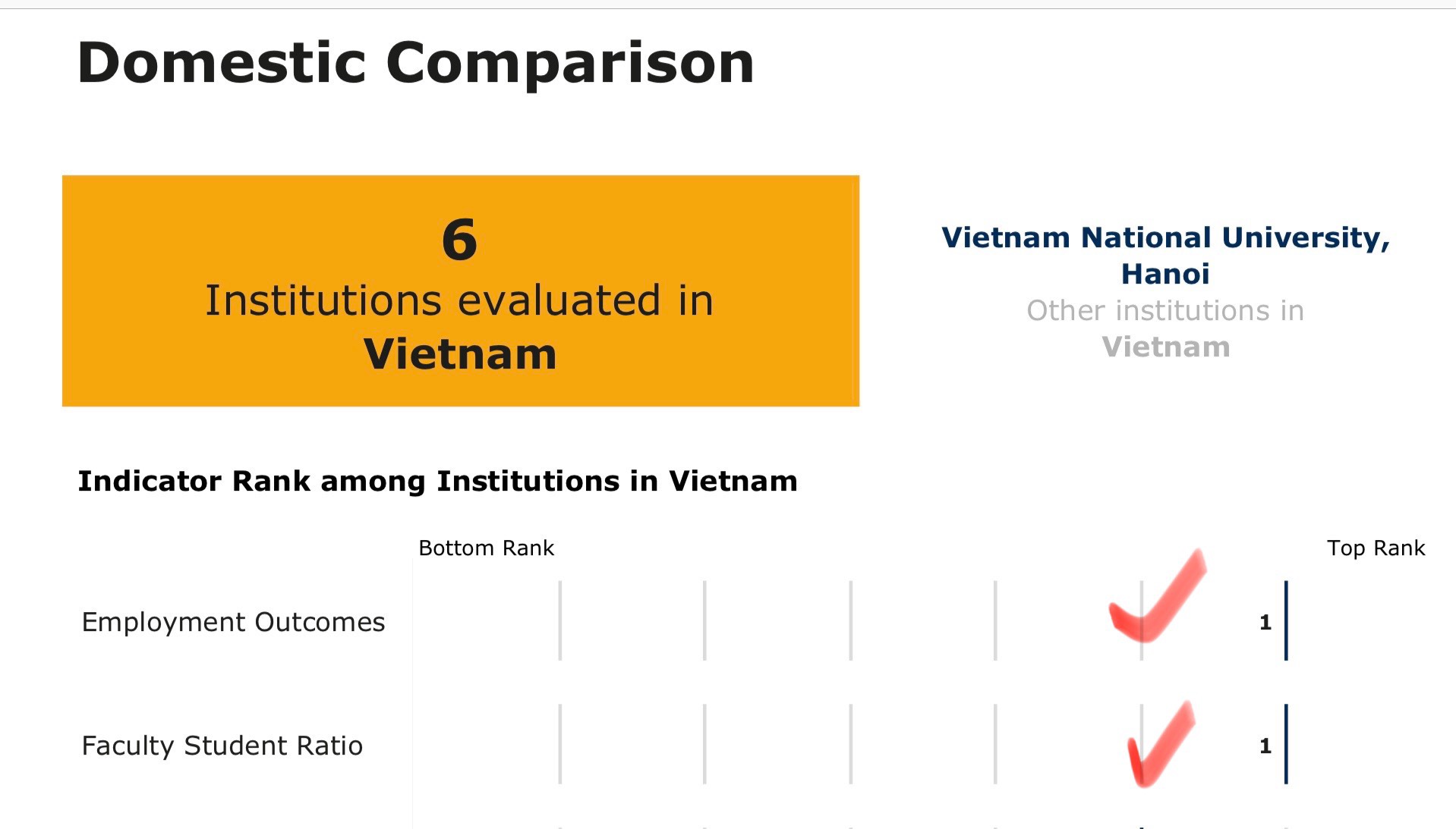Kết quả xếp hạng năm nay có đóng góp lớn từ chất lượng và ảnh hưởng của người học tốt nghiệp ĐHQGHN, trong đó các tiêu chí Kết quả tuyển dụng được xếp hạng 202 thế giới và Uy tín tuyển dụng được xếp hạng 472 thế giới.