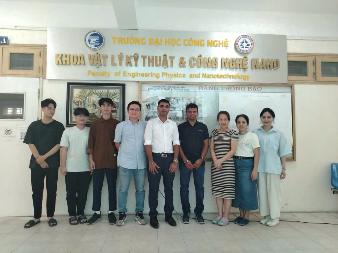 Tharindu chụp ảnh cùng PGS.TS Đỗ Thị Hương Giang và nhóm nghiên cứu tại Khoa Vật lý kỹ thuật và công nghệ nano