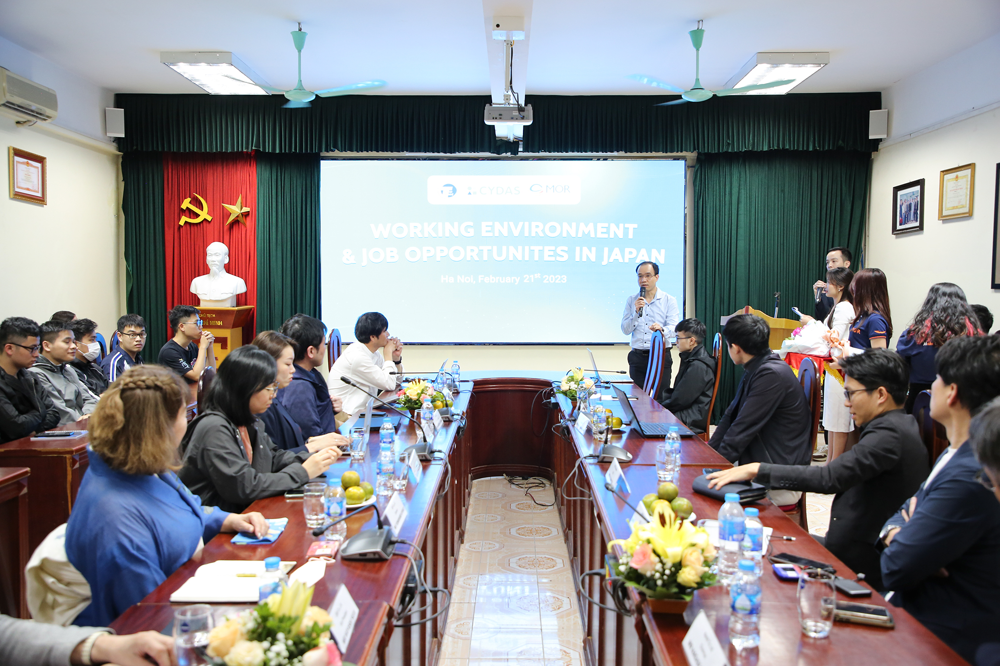 Tại hội thảo, các sinh viên đã lắng nghe ông Matsuda Shin – Giám đốc Công ty Cydas Inc và ông Vũ Văn Tú – Giám đốc Công ty Cổ phần MOR Software lần lượt chia sẻ về lịch sử hình thành, môi trường làm việc, những phần mềm công nghệ, đặc biệt là cơ hội việc làm dành cho sinh viên. Công ty Cổ phần Cydas Inc được thành lập tháng 10/2011 trụ sở tại Tokyo (Nhật Bản), với sứ mệnh “kiến tạo thế giới mới hạnh phúc hơn”. Cydas với lịch sử hơn 10 năm phát triển và là công ty tiên phong về quản lý nhân sự tại Nhật Bản, luôn mong muốn xây dựng nên công ty nói riêng và xã hội nói chung – nơi mọi người có thể phát huy hết tài năng của mình và đóng góp vào sự phát triển cho cộng đồng.Phần chia sẻ của ông Vũ Văn Tú – Giám đốc và là một trong những thành viên sáng lập Công ty Cổ phần MOR Software được sinh viên quan tâm khi nhắc đến những ngày tháng ban đầu khi được thành lập vào năm 2016. Anh nhấn mạnh tầm quan trọng về việc trau dồi ngoại ngữ khi muốn làm việc và hòa nhập vào văn hóa Nhật Bản.