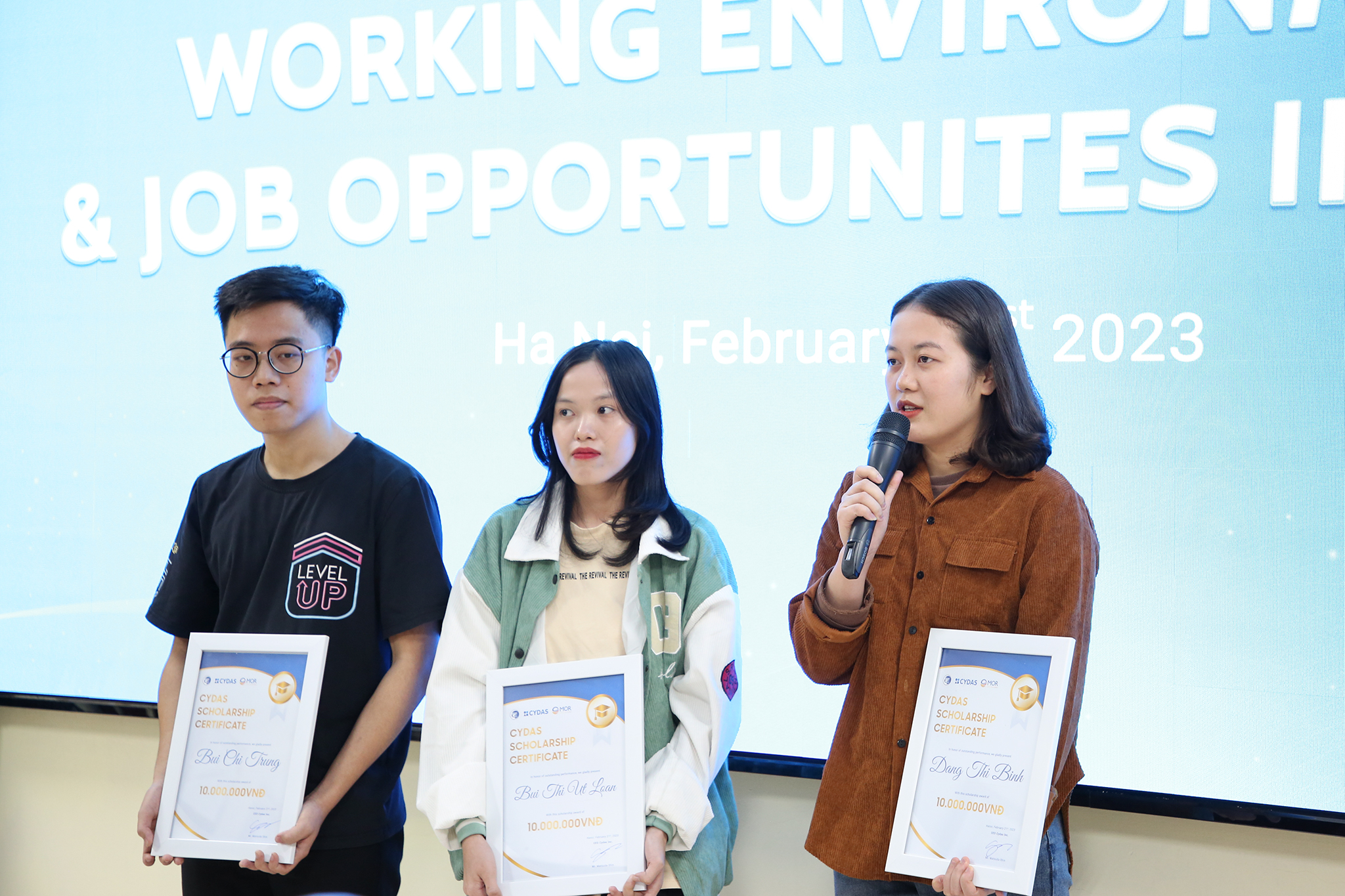 Ngoài những chia sẻ bổ ích về những kinh nghiệm và môi trường việc làm tại Nhật Bản, các sinh viên QH-2019-I/CQ Trường ĐH Công nghệ đã nhận được học bổng từ Công ty Cydas gồm sinh viên Bùi Chí Trung (ngành Công nghệ thông tin); Bùi Thị Út Loan (ngành Công nghệ thông tin định hướng thị trường Nhật Bản); Đặng Thị Bình (ngành Công nghệ thông tin). Chia sẻ về cảm xúc khi may mắn là một trong những sinh viên nhận được học bổng này, sinh viên Đặng Thị Bình bày tỏ niềm vui: “Thông qua Nhà trường em biết đến buổi hội thảo và cơ hội nhận học bổng của các doanh nghiệp Nhật Bản, đối với em nói riêng và những sinh viên học ngành Công nghệ thông tin định hướng thị trường Nhật Bản nói chung thì đây là hoạt động vô cùng ý nghĩa. Chương trình này giúp chúng em có thêm những hiểu biết về môi trường, văn hóa doanh nghiệp Nhật Bản, đồng thời học bổng còn thể hiện sự ghi nhận của Trường và công ty đối với những kết quả, sự nỗ lực của chúng em trên con đường học tập, nghiên cứu”.