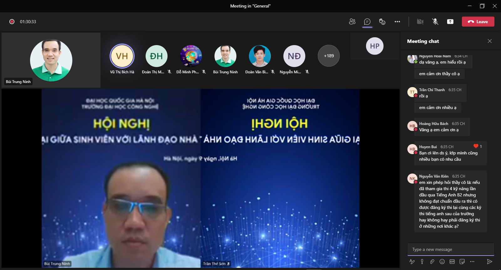 Trước những diễn biến phức tạp của dịch Covid-19, ngày 09/12, Trường Đại học Công nghệ (Đại học Quốc gia Hà Nội) triển khai và tăng cương chương trình đối thoại giữa lãnh đạo Nhà trường với nghiên cứu sinh, học viên, sinh viên sang hình thức trực tuyến.