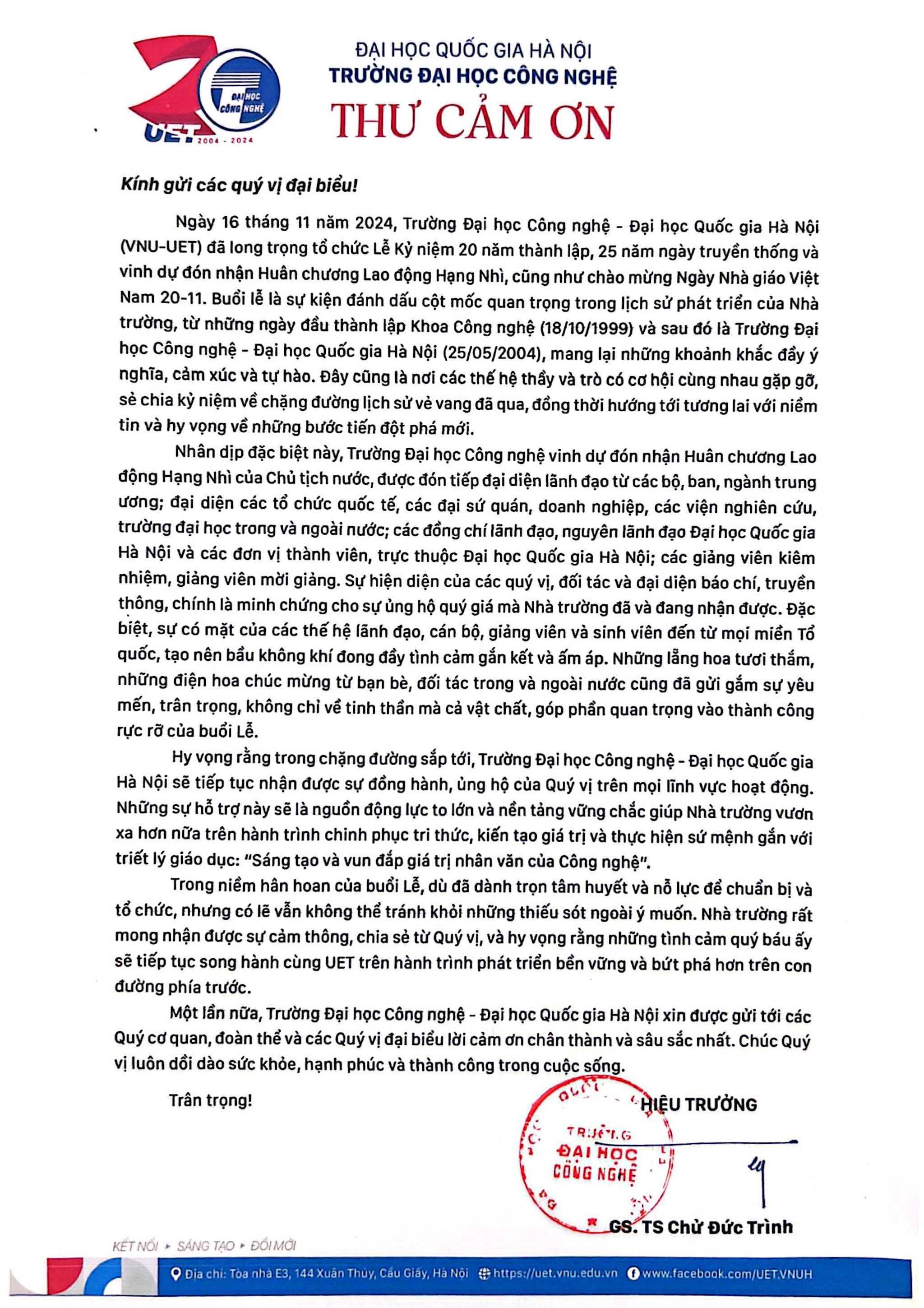 Thư cảm ơn Lễ Kỷ niệm 20 năm thành lập, 25 năm ngày truyền thống và vinh dự đón nhận Huân chương Lao động Hạng Nhì, chào mừng Ngày Nhà giáo Việt Nam 20-11