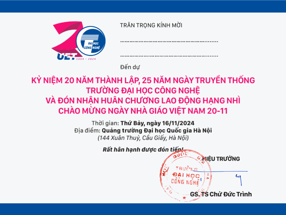Nhân dịp này, Trường Đại học Công nghệ trân trọng kính mời Quý thầy cô cùng các thế hệ sinh viên, học viên, nghiên cứu sinh tới dự Lễ Kỷ niệm và hòa nhịp trong niềm vui chung của Trường Đại học Công nghệ.