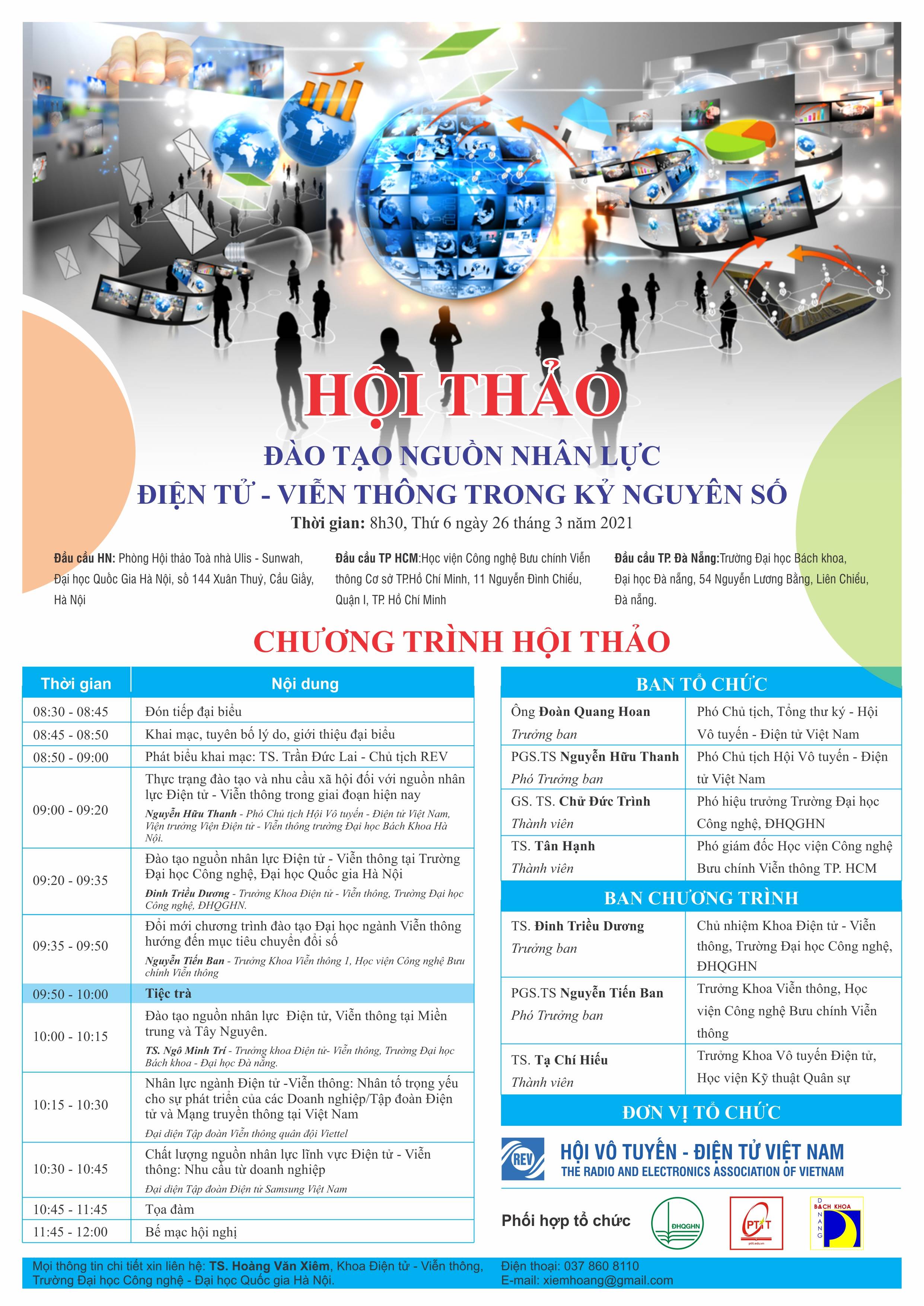 Trường Đại học Công nghệ – Đại học Quốc gia Hà Nội, Hội vô tuyến – Điện tử Việt Nam và các đối tác xin trân trọng kính mời quý học giả đến dự Hội thảo “Đào tạo nguồn nhân lực Điện tử – Viễn thông trong kỷ nguyên số”.
