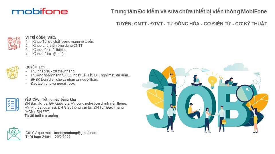 Trung tâm Đo kiểm và sửa chữa thiết bị viễn thông MobiFone tuyển dụng các vị trí kỹ sư