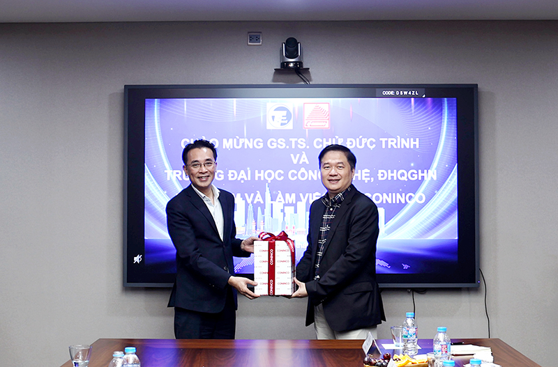 Tại buổi làm việc, GS. TS. Chử Đức Trình – Hiệu trưởng Trường ĐH Công nghệ (bên trái ảnh) nhận quà lưu niệm từ TS. Hà Minh – Chủ tịch HĐQT CONINCO