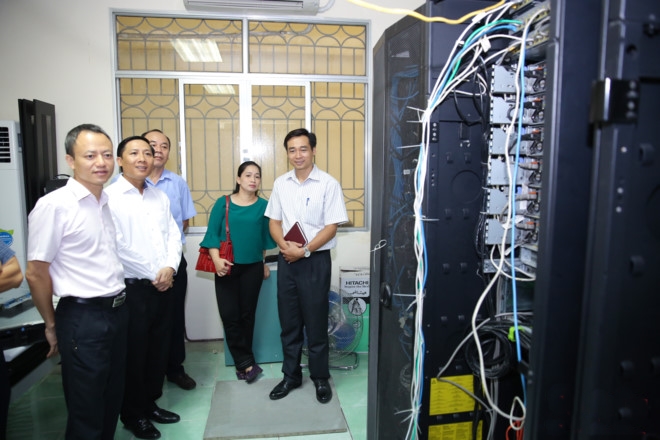 Giám đốc trung tâm Nguyễn Thanh Liêm tham quan Trung tâm máy tính của Trường ĐHCN
