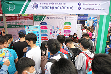 Tại gian hàng trường Đại học Công nghệ (UET), sĩ tử đã được Ban tư vấn gồm các thầy/cô là cán bộ tuyển sinh cung cấp những thông tin về phương thức xét tuyển Đại học năm 2021, tiêu chí xét tuyển học bạ, giải đáp thắc mắc xoay quanh chương trình Chuẩn, chất lượng cao, học bổng…. Những bạn chót “cảm nắng”, muốn “về chung nhà” với UET thì sẽ được giới thiệu sâu hơn về môi trường, lộ trình học tập, lợi thế của sinh viên khi theo học tại UET, cùng với đó là cơ hội việc làm phong phú sau khi tốt nghiệp.