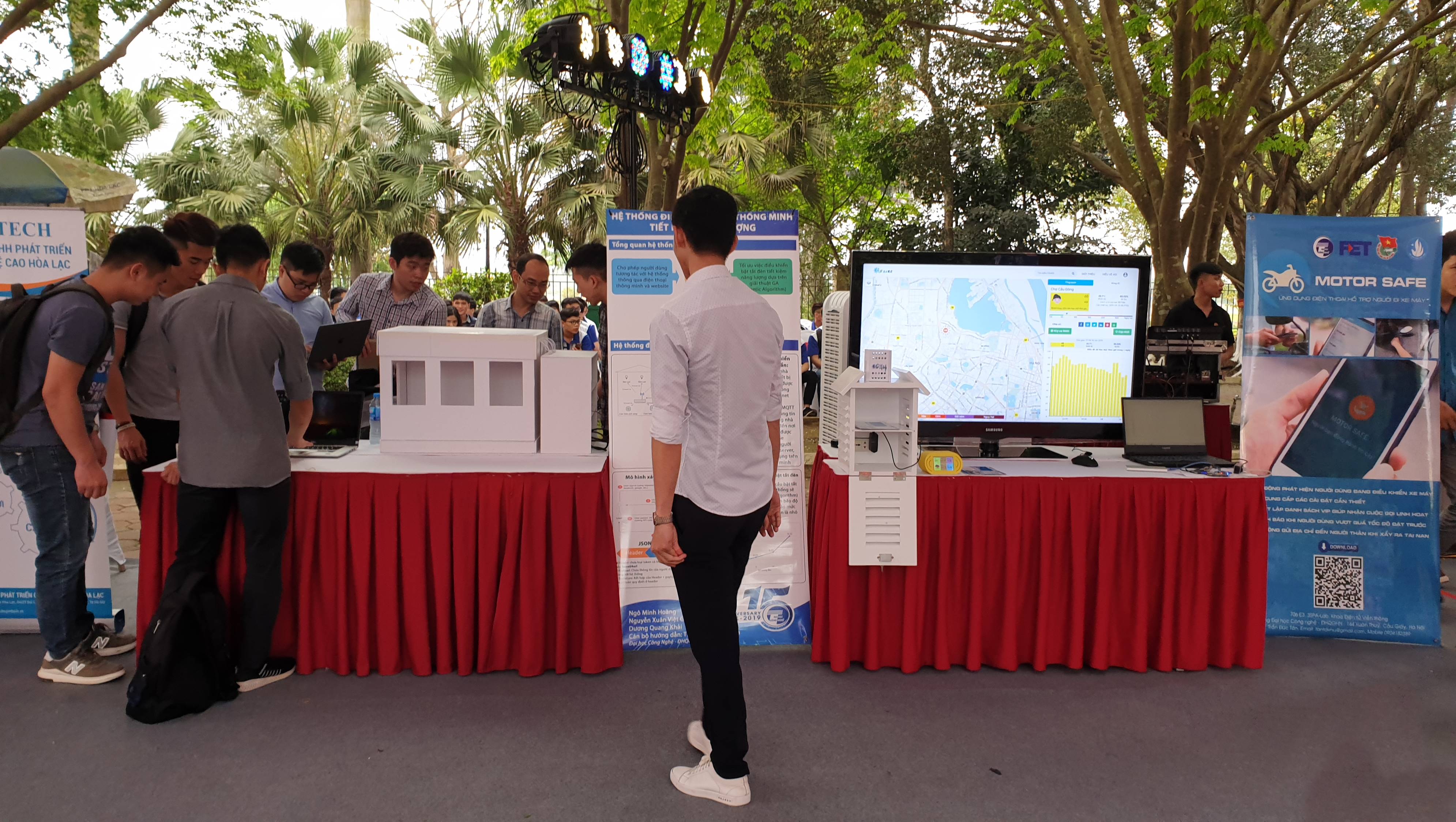 Tại buổi lễ, Nhà trường đã tổ chức 02 gian trưng bày với các sản phẩm khoa học công nghệ tiêu biểu. Đây là những sản phẩm thể hiện quá trình đổi mới, sáng tạo, thương mại hoá, chuyển giao công nghệ, khởi nghiệp. Các sản phẩm của Trường ĐHCN trưng bày gồm: Hệ thống giám sát chất lượng không khí https://fairnet.vn; Hệ thống giám sát tự động, thời gian thực cho xưởng sản xuất nấm quy mô công nghiệp; Cụm sản phẩm “Hệ WSN cảnh báo trượt đất”, “Trạm đo thời tiết di động”, “MotorSafe ứng dụng hỗ trợ người đi xe máy”; Mô hình nhà thông minh.