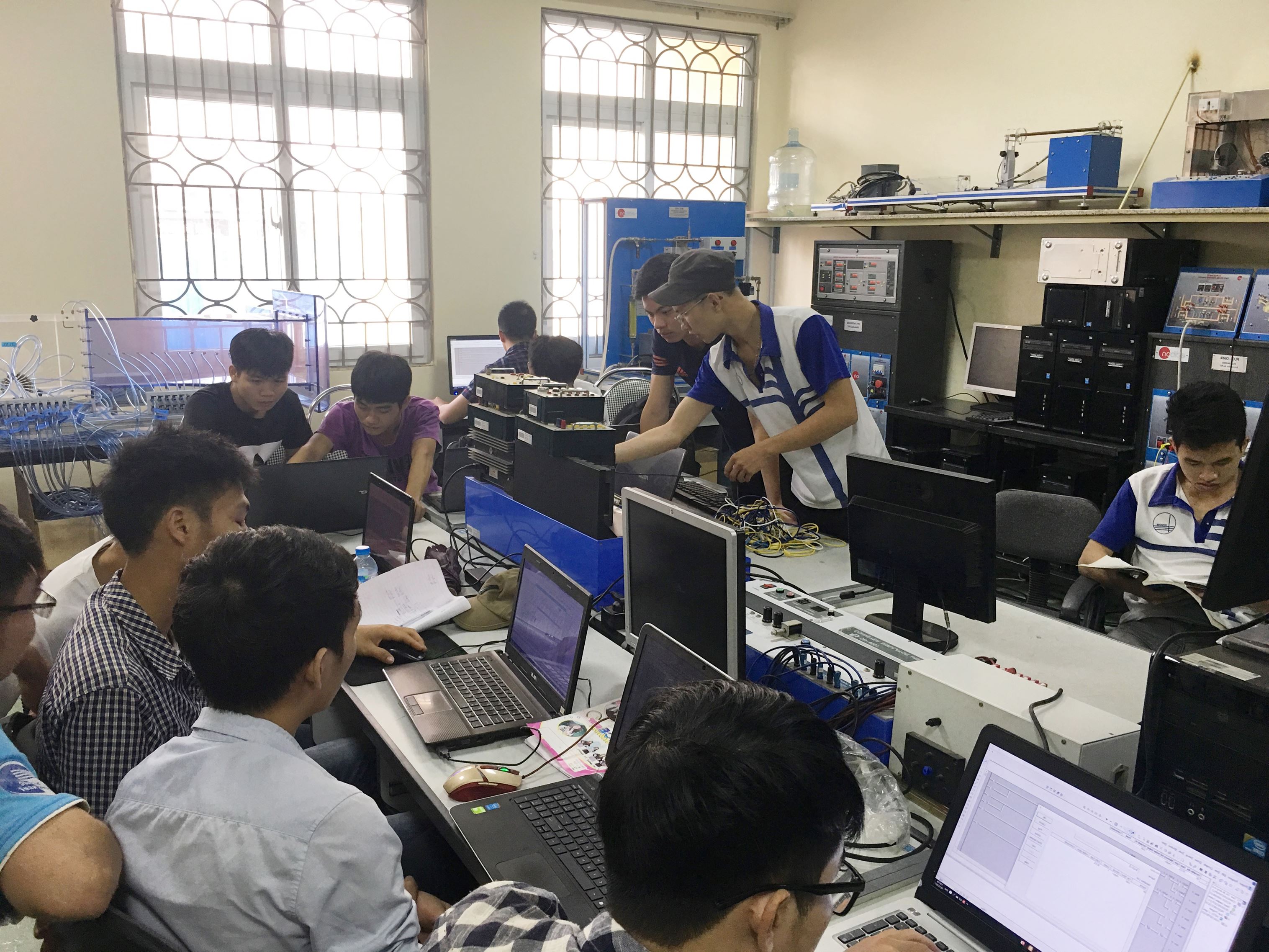 Nhóm sinh viên tham gia nghiên cứu sản phẩm lập trình PLC tại PTN Khoa CHKT&TĐH Trường ĐHCN