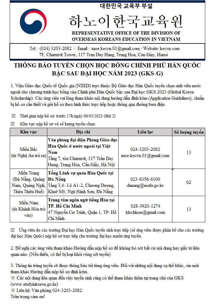 – Các nội dung liên quan đến việc tuyển sinh vui lòng tham khảo thêm tại trang chủ của GKS (www.studyinkorea.go.kr) hoặc trang web: kecvn.com
