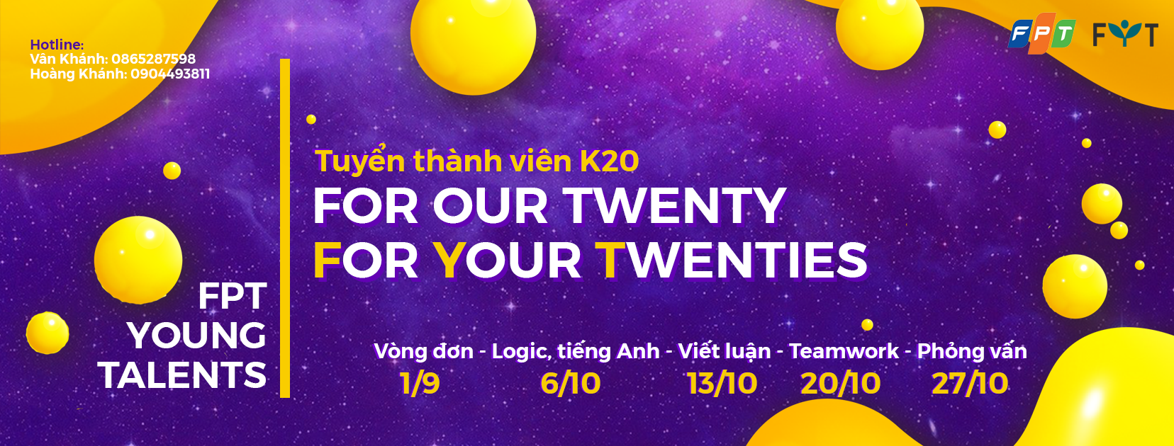 Với mỗi thành viên, FYT thực sự là trường học nâng cao chuyên môn, là điểm tựa tinh thần trước thử thách của cuộc sống, là mái nhà với những người anh em thân thiết gắn bó trên những bước đường đời. Hiện nay, Trung tâm Tài năng trẻ FPT (FPT Young Talents – FYT) đã chính thức khởi động Kỳ Tuyển thành viên Khóa 20.