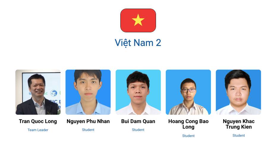 Đội tuyển Việt Nam tham gia IOAI 2025 tại Trung Quốc do ông Nguyễn Hoàng Giang – Viện trưởng Viện RIVA (Trưởng đoàn) và TS. Trần Quốc Long – Viện trưởng Viện Trí tuệ nhân tạo, Trường ĐH Công nghệ với vai trò Phó trưởng đoàn cùng các huấn luyện viên, quan sát viên dẫn đoàn