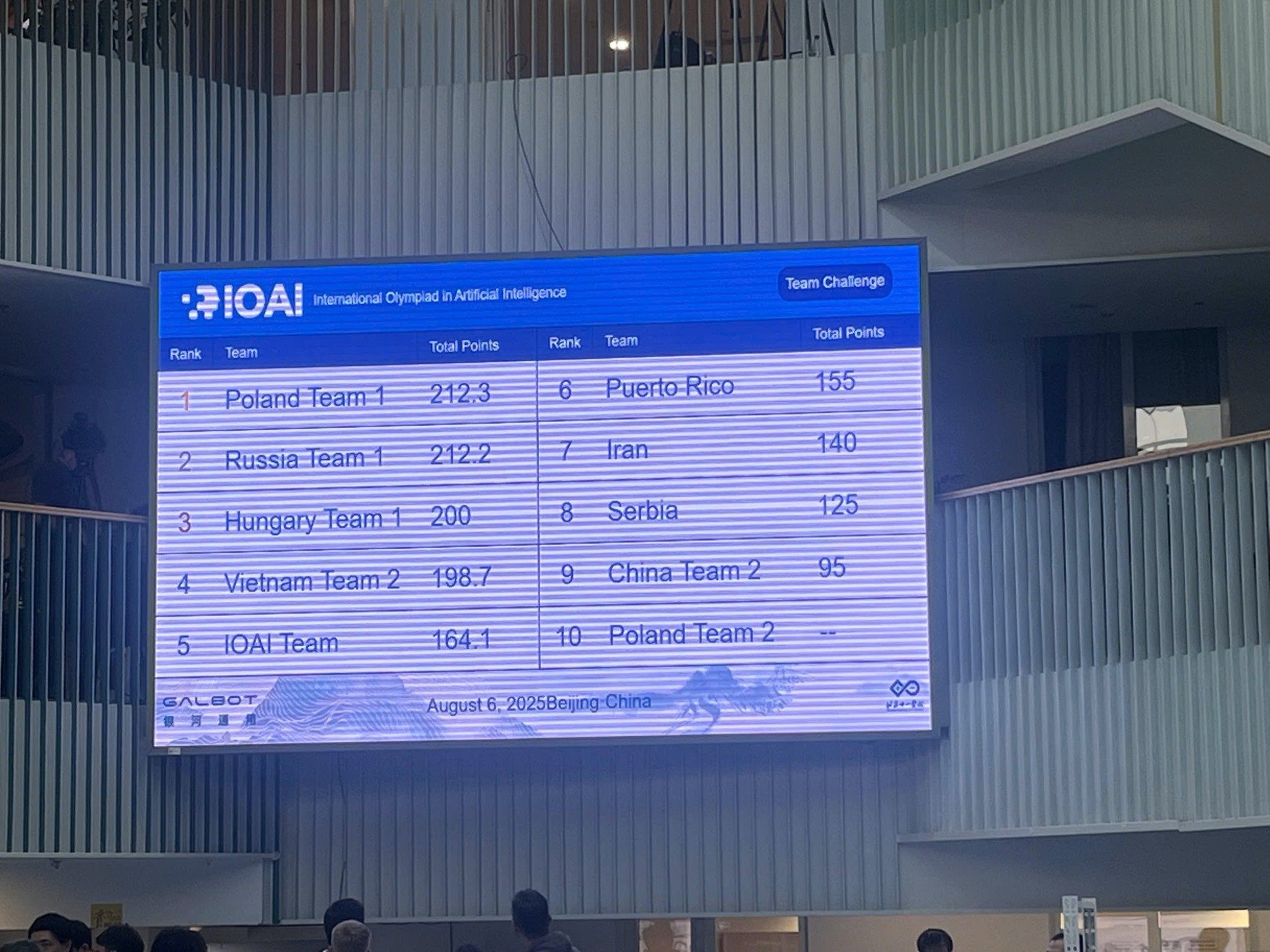 Theo quy chế của Hội đồng IOAI 2025, kỳ thi có 3 hình thức thi gồm cá nhân tranh giải; cá nhân GAITE và đồng đội. Bên cạnh giải thưởng ở nội dung cá nhân tranh giải, thì phần nội dung thi đồng đội, đội tuyển Việt Nam 2 gồm các em Nguyễn Khắc Trung Kiên, Hoàng Công Bảo Long, Nguyễn Phú Nhân, Bùi Đàm Quân dẫn đầu vòng sơ loại với 140 điểm và lọt vào chung kết cùng 9 đội quốc tế. Chung cuộc, đội xếp hạng 4 với 198,4 điểm, chỉ sau Ba Lan, Nga và Hungary.