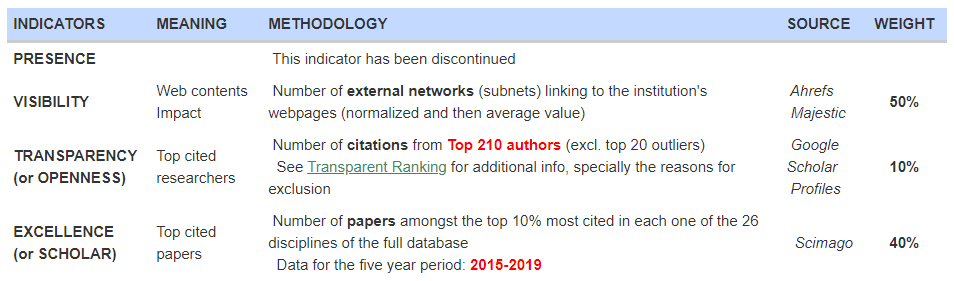 Trong kỳ xếp hạng này, Webometrics vẫn duy trì phương pháp xếp hạng như ở kỳ tháng 01/2021. Cụ thể, tiêu chí “Presence” (Lượng tài nguyên số hóa) đã được loại bỏ trong phương pháp xếp hạng, tiêu chí Impact (Mức độ ảnh hưởng) có trọng số cao nhất (50%), tiếp theo là tiêu chí Excellence (Sự xuất sắc) có trọng số 40% và tiêu chí Openness (Độ mở học thuật) có trọng số 10%.
